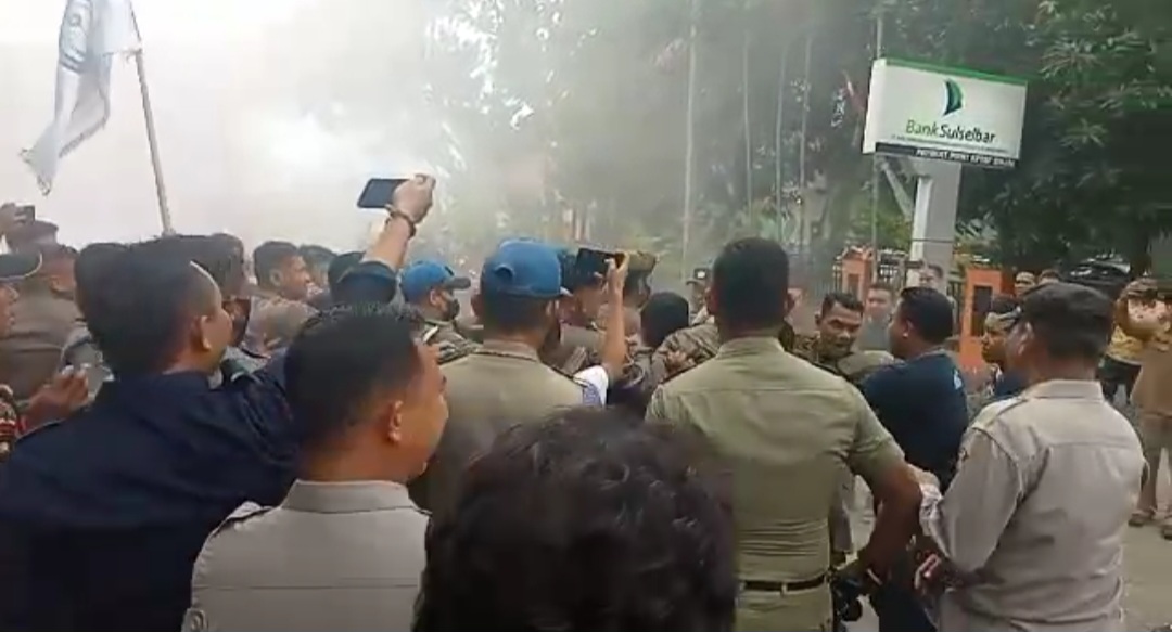 Saat membakar ban bekas, salah satu anggota dari Satpol-PP dan Damkar menyemprotkan Alat Pemadaman Api Ringan (APAR). Namun, aksi penyemprotan itu membuat asap mengepul sehingga pengunjuk rasa keberatan dan saling dorong pun tak terhindar.