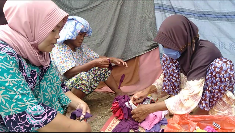 “Di beberapa titik pengungsian kami sudah lakukan seperti di Pasar Baebunta, Panampung, Meli, Kampal, Kantor Bupati, dan juga di SMP 4. Jadi sisa pakaian bekas yang berlimpah hasil dari donasi yang masuk ke Luwu Utara, dimanfaatkan untuk dijadikan keset/lap kaki, kemudian dijual. Selain bermanfaat untuk menghilangkan trauma, juga bernilai ekonomis bagi ibu-ibu,” papar Hariana.