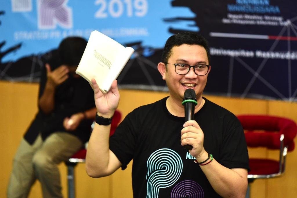 Bersama Deputi Direktur Startegi dan Pelayanan Informasi OJK Wilayah VI Sulawesi-Maluku dan Papua (Sulampua), Rahman Mangussara, Devo Khaddafi tampil interaktif pada diskusi OJK PR Talks 2019 yang mengusung tema Strategi PR 4.0 di Era Milenial, di Gedung IPTEKS Unhas, Kamis (14/11/2019) kemarin.