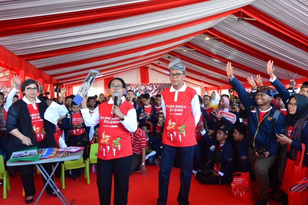 NA bersama Menteri Pemberdayaan Perempuan dan Perlindungan Anak RI Yohana Susana Yembise berkeliling Lapangan Karebosi selama empat jam untuk menyaksikan aneka atraksi dan kreasi yang ditampilkan anak-anak yang datang dari penjuru nusantara.