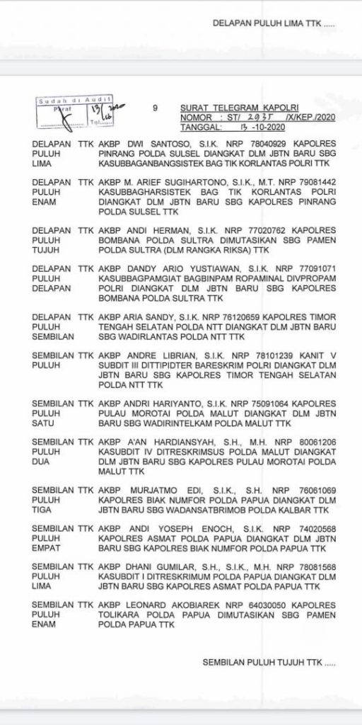 “AKBP Andi Herman S.I.K NRP 77020762 Kapolres Bombana Polda Sultra di mutasikan menjadi Pamen Polda Sultra (Dlm rangka riksa) ttk,” surat telegram itu.