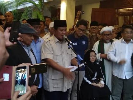 “Kepada seluruh pendukung pasangan 02 dari berbagai kalangan dari parpol koalisi para ulama relawan tokoh agama dari semua agama para pemuda pemudi milenial seluruh emak dan bapak militan kami ajak bersyukur rasa syukur yang sedalam-nya,” katanya.