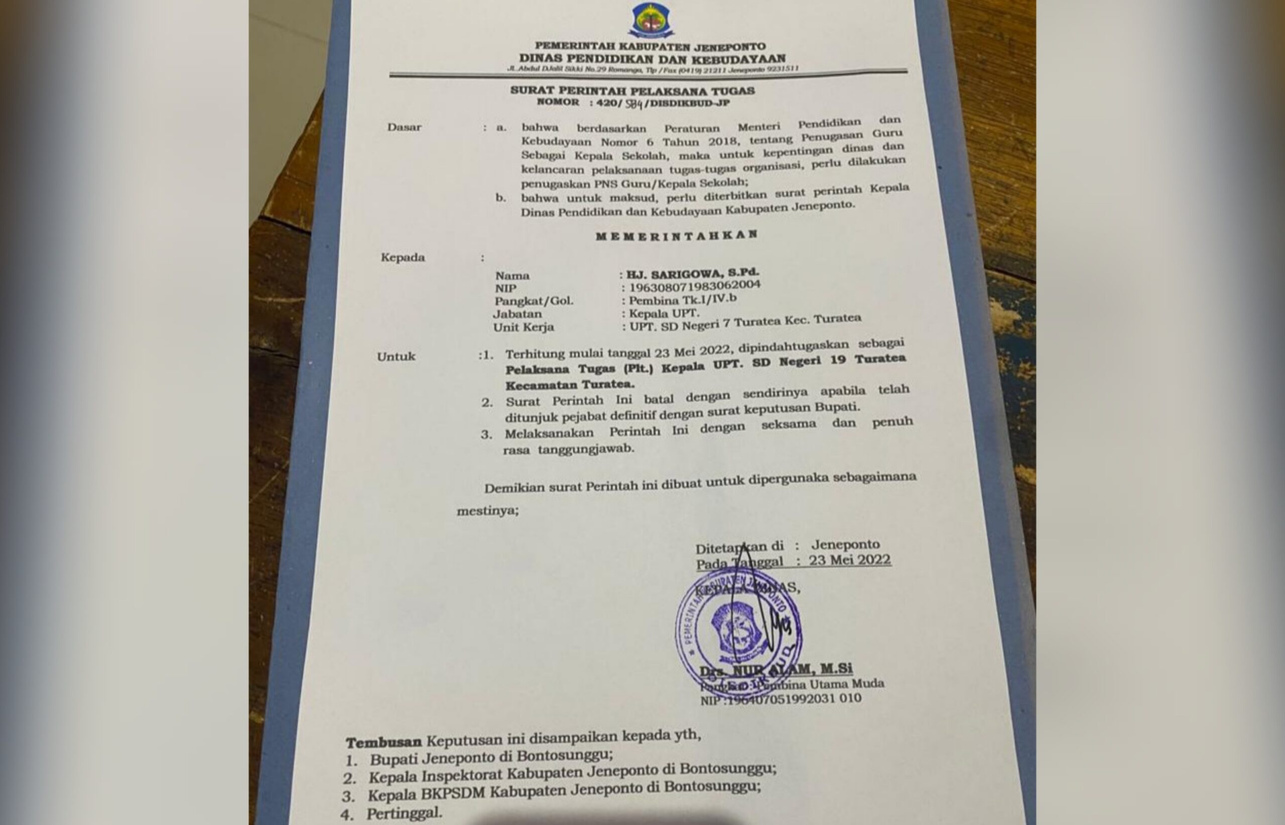 Kepala Dinas Pendidikan Jeneponto Nur Alam Basir menjelaskan, Sarigowa tidak lagi menjadi kepala sekolah dan dipindahkan ke sekolah SDN 19 Turatea terhitung dari tanggal 23 Mei 2022.