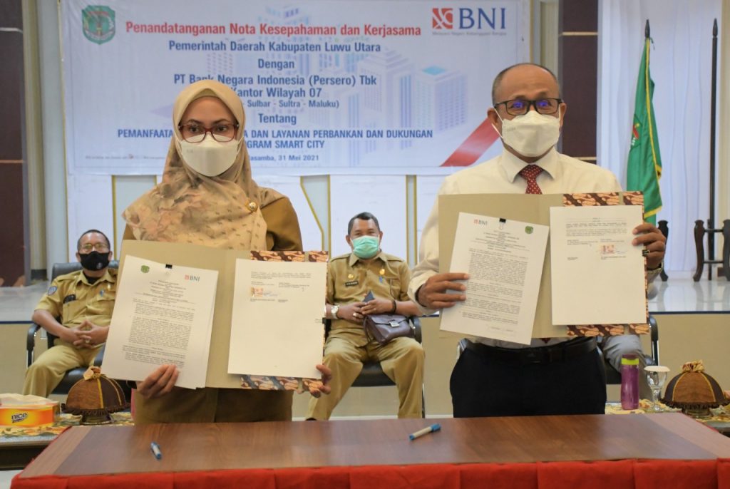 REPUBLIKNEWS.CO.ID,MASAMBA — PT Bank Negara Indonesia (BNI) Persero Tbk Kantor Wilayah 07 (Sulsel-Sulbar-Sultra-Maluku), menggandeng Pemerintah Kabupaten Luwu Utara untuk menjalin kerjasama dalam Pemanfaatan Fasilitas Jasa dan Layanan Perbankan dan Dukungan Program Smart City.