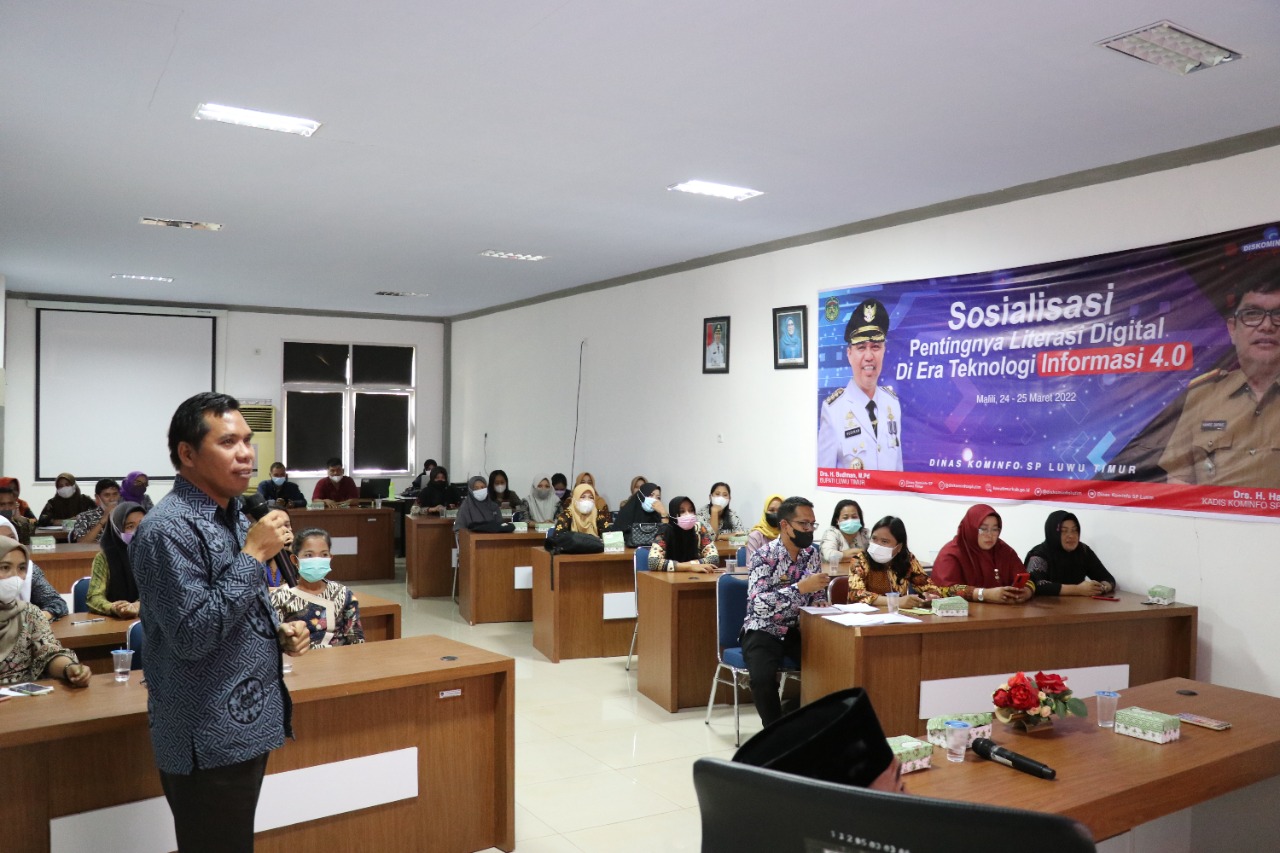 REPUBLIKNEWS.CO.ID, LUWU TIMUR- Guna memberikan pengetahuan tentang Pentingnya Literasi Digital di Era Teknologi Informasi 4.0, khususnya bagi pengelola Perpustakaan Desa se-Kabupaten Lutim, maka Dinas Komunikasi, Informatika, Statsitik dan Persandian (Diskominfo-SP) Kabupaten Luwu Timur (Lutim) melalui Bidang Informasi Komunikasi Publik dan Hubungan Masyarakat (IKP dan Humas) menggelar Sosialisasi Pentingnya Literasi Digital di Era Teknologi Informasi 4.0, Kamis (24/03/2022).