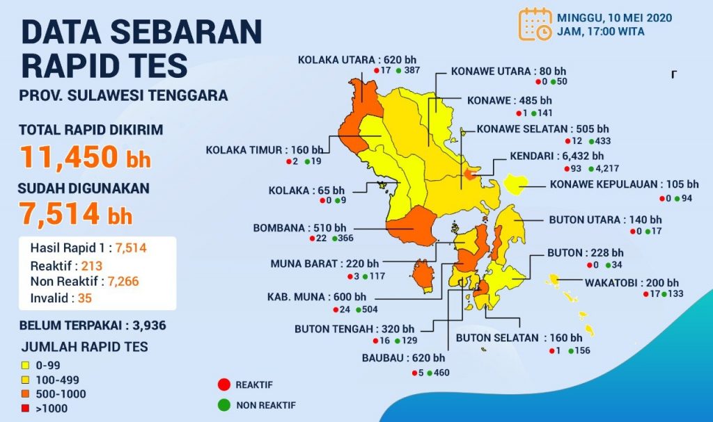 Sementara itu untuk rincian alat Rapid-test, Kota Kendari (6.432), Kabupaten Konawe Selatan (505), Kabupaten Konawe (485), Kabupaten Konawe Utara (80), Kabupaten Konawe Kepulauan (105), Kabupaten Kolaka Utara (620), Kabupaten Kolaka Timur (160), Kabupaten.Kolaka (65), Kabupaten Bombana (510), Kabupaten Muna Barat (220), Kabupaten Muna(600), Kabupaten Buton Tengah (320), Kota Bau-Bau (620), Kabupaten Buton Selatan (160), Kabupaten Wakatobi (200), Kabupaten Buton (228) dan Kabupaten Buton Utara (140). (Akbar Tanjung)