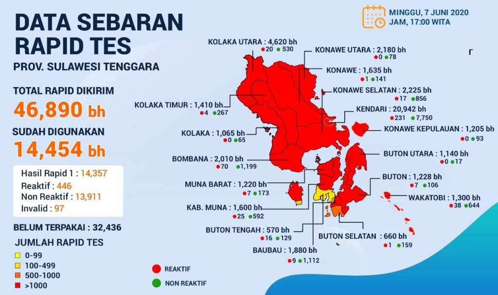 Masih berdasarkan data tabel dari Gugus Tugas Provinsi Sultra, hasil Rapid-test yang telah digunakan yaitu 446 Reaktif dan 13.911 Non Reaktif. Adapun data sebarannya yaitu sebagai berikut: