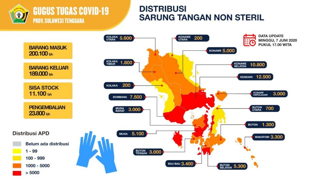 REPUBLIKNEWS.CO.ID, KENDARI — Gugus Tugas Percepatan Penanganan Covid-19 Provinsi Sulawesi Tenggara (Sultra) mendistribusikan Sarung Tangan Non Steril ke Gugus Tugas 17 Daerah Kabupaten dan Kota.