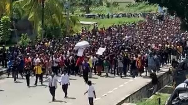 Setelah menurunkan paksa jenazah Lukas Enembe, warga mengarak dengan berjalan kaki dari area Bandara Sentani di Sentani ke Jayapura. Aksi warga ini dikawal ketat pasukan gabungan TNI dan Polri.
