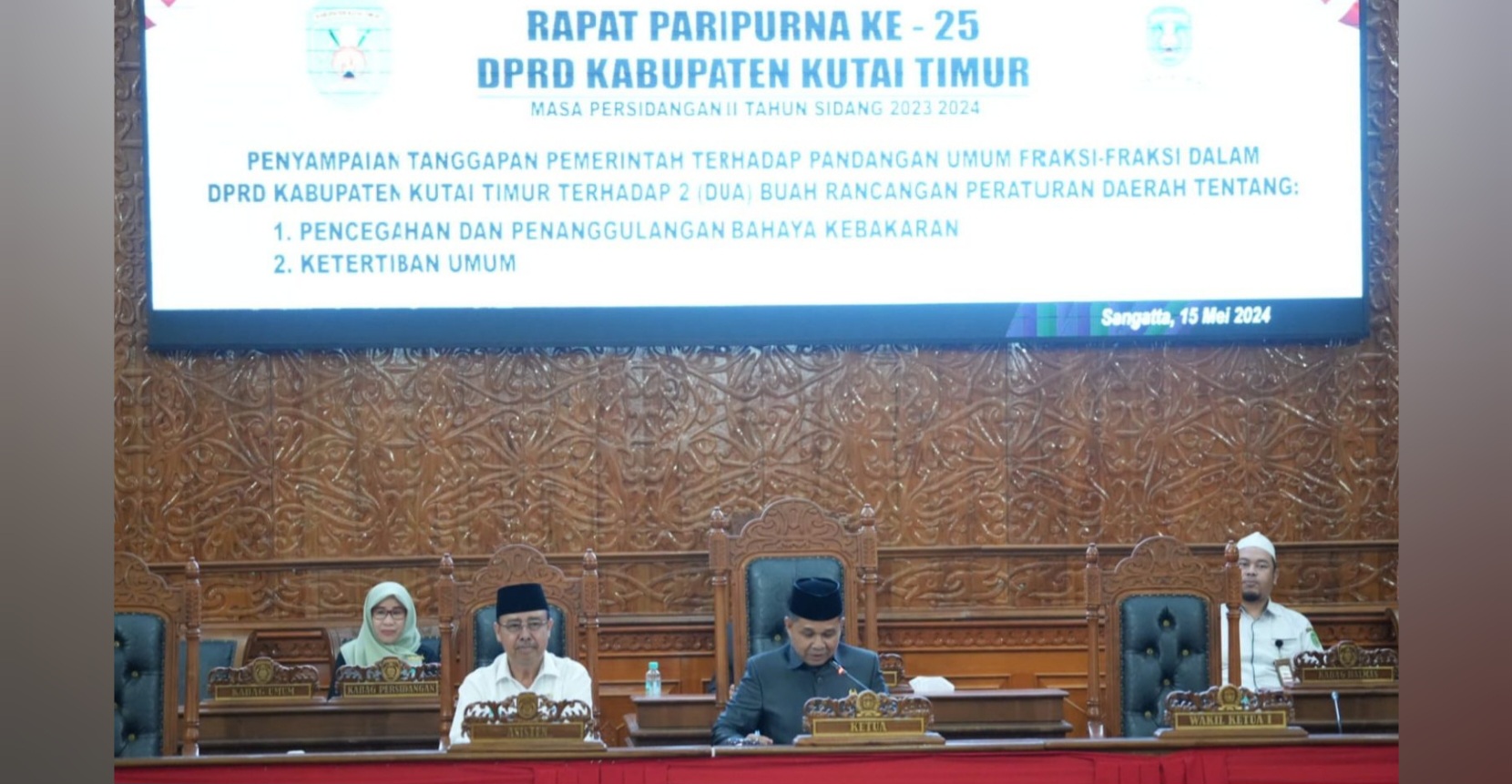 REPUBLIKNEWS.CO.ID, KUTAI TIMUR – Dewan Perwakilan Rakyat Daerah (DPRD) Kutai Timur (Kutim) menggelar Rapat Paripurna ke-25 mengenai Penyampaian Tanggapan Pemerintah Kutim Terhadap Pandangan Umum (PU) Fraksi-fraksi DPRD Kutim tentang Rancangan Peraturan Daerah (Raperda) Pencegahan, Penanggulangan Bahaya Kebakaran dan Ketertiban Umum. Rapat Paripurna ini dihelat di Ruang Sidang Utama DPRD Kutim, Kompleks Perkantoran Bukit Pelangi, Sangatta Utara, Rabu (15/05/2024).