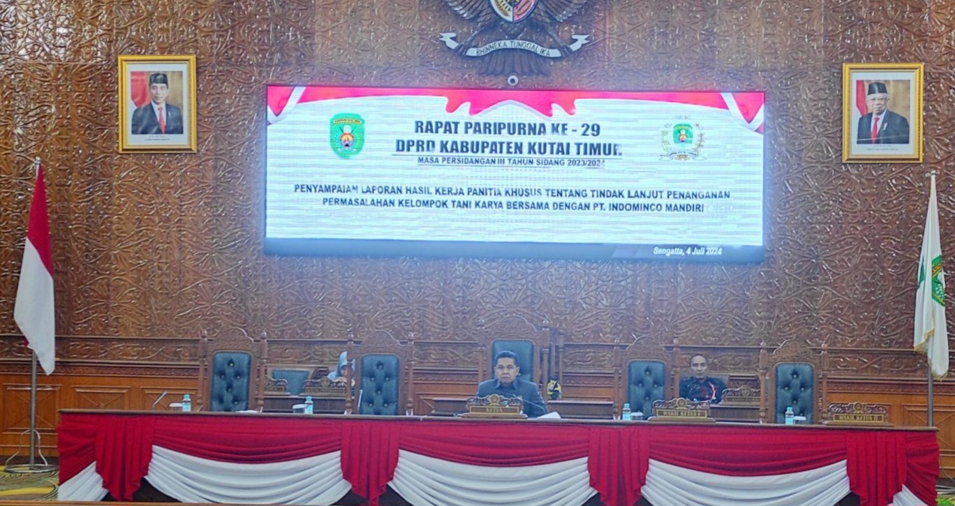 REPUBLIKNEWS.CO.ID, KUTAI TIMUR —- Dewan Perwakilan Rakyat Daerah (DPRD) Kabupaten Kutai Timur (Kutim) menggelar Rapat Paripurna ke-29 terkait Penyampaian Laporan Hasil Kerja (LHK) Panitia Khusus (Pansus) DPRD Kutim terkait tindak lanjut Penanganan Permasalahan Kelompok Tani (Poktan) Karya Bersama dengan PT Indominco Mandiri di Ruang Sidang Utama DPRD Kutim, Kompleks Perkantoran Bukit Pelangi, Sangatta Utara, Kamis (04/07/2024).