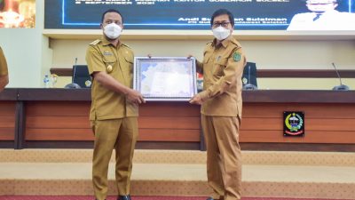Penghargaan diserahkan Plt. Gubernur Sulawesi Selatan, Andi Sudirman Sulaiman, dan diterima Wakil Bupati Luwu Utara, Suaib Mansur, Senin (6/9/2021), di Aula Pertemuan Pimpinan Daerah Kantor Gubernur Sulawesi Selatan, Makassar. Wabup Suaib Mansur didampingi masing-masing inovator, Suharto (Rompi KPK) dan Ikbal Cahyadi (Bappeda).