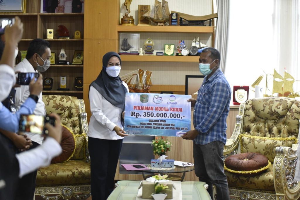 REPUBLIKNEWS.CO.ID, LUWU UTARA — Bupati Luwu Utara Indah Putri Indriani, menyerahkan secara simbolis pinjaman modal kerja melalui Lembaga Pengelola Modal Usaha Kelautan dan Perikanan (LPMUKP) kepada dua orang pmbudidaya ikan air tawar dan ikan bandeng di Ruang Kerja Bupati, Rabu (21/04/2021).