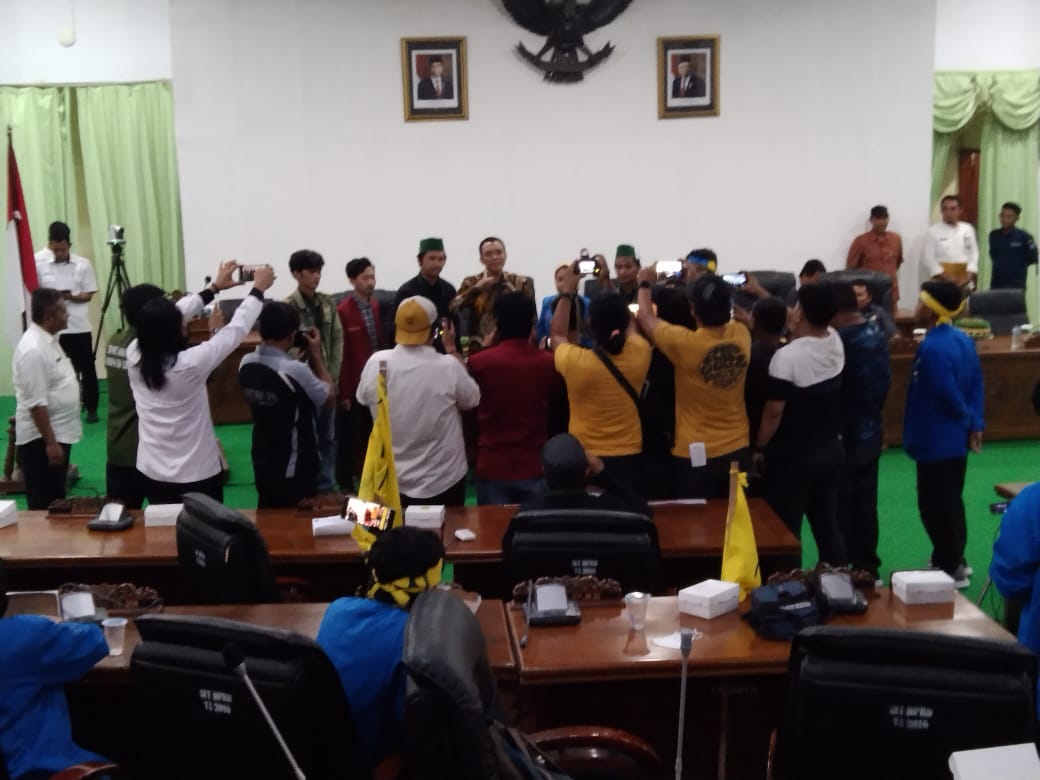 Setelah saling meminta instruksi, Ketua DPRD Kabupaten Soppeng H. Syahruddin M Adam muncul di depan para mahasiswa dan langsung spontan menanyakan apakah ada yang mau ditanda tangani.