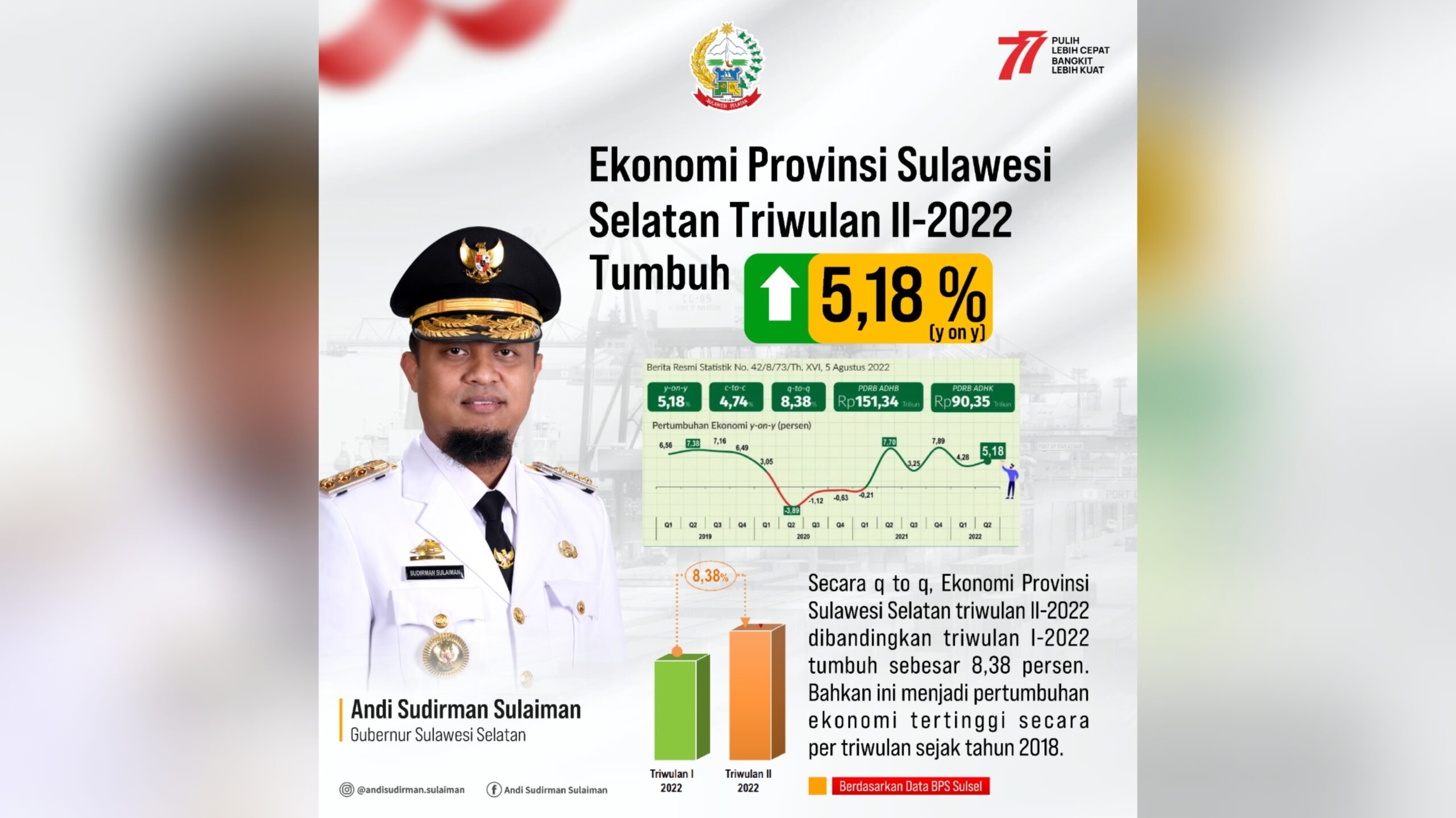 “Alhamdulillah, Ekonomi Provinsi Sulawesi Selatan triwulan II-2022 tumbuh 5,18 persen (y on y) berdasarkan data BPS Sulsel. Secara q to q, Ekonomi Provinsi Sulawesi Selatan triwulan II-2022 dibandingkan triwulan I-2022 tumbuh sebesar 8,38 persen. Ini pertumbuhan ekonomi tertinggi secara triwulanan sejak tahun 2018,” tuturnya, Sabtu (6/8/2022).