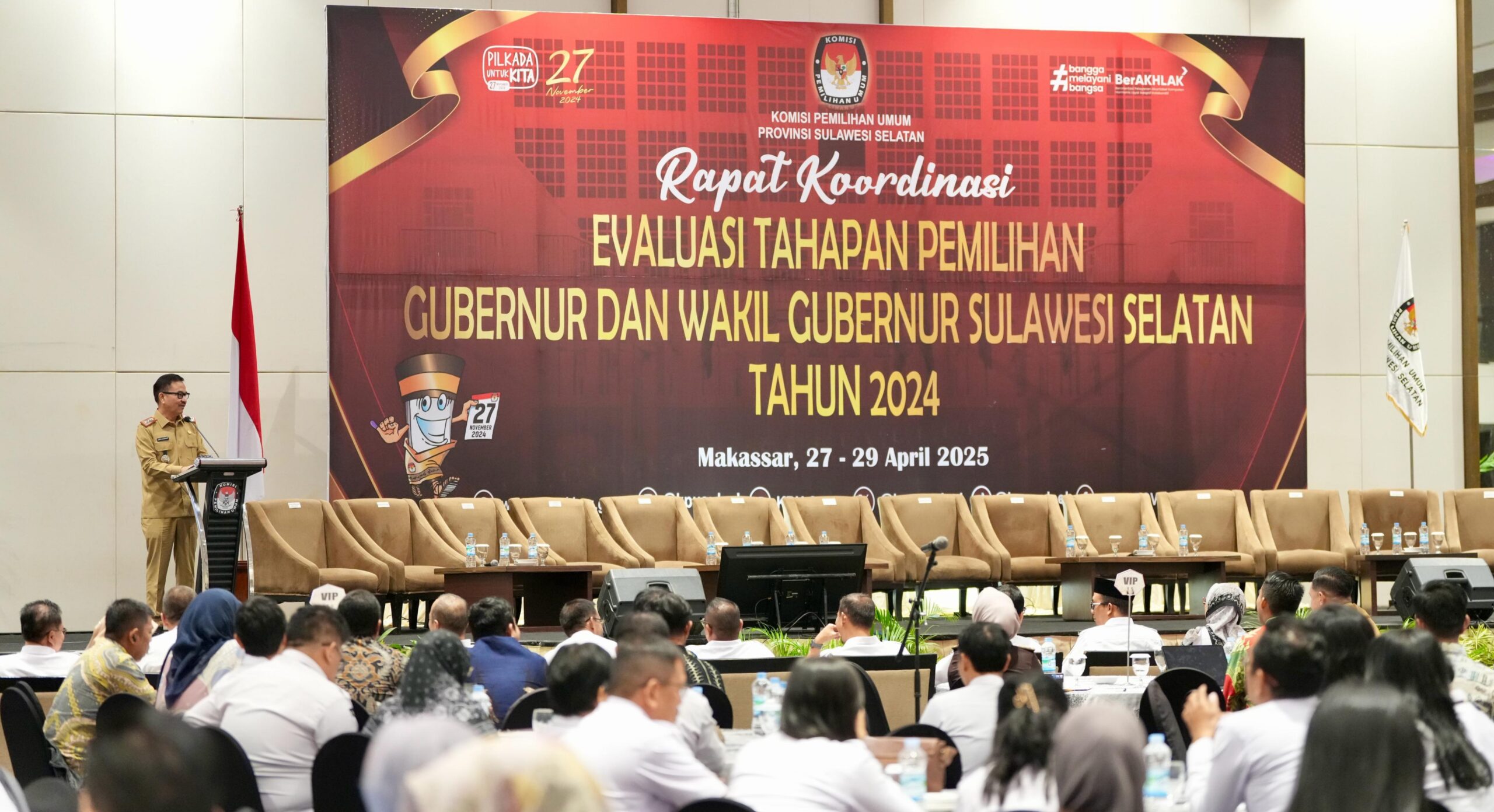 Sekretaris Daerah (Sekda) Provinsi Sulawesi Selatan, Jufri Rahman, menyampaikan apresiasinya saat membacakan sambutan Gubernur Sulsel pada Rapat Koordinasi Evaluasi Tahapan Pemilihan Gubernur dan Wakil Gubernur Sulsel di Hotel Claro, Jalan AP Pettarani, Makassar, Senin (28/4/2025).