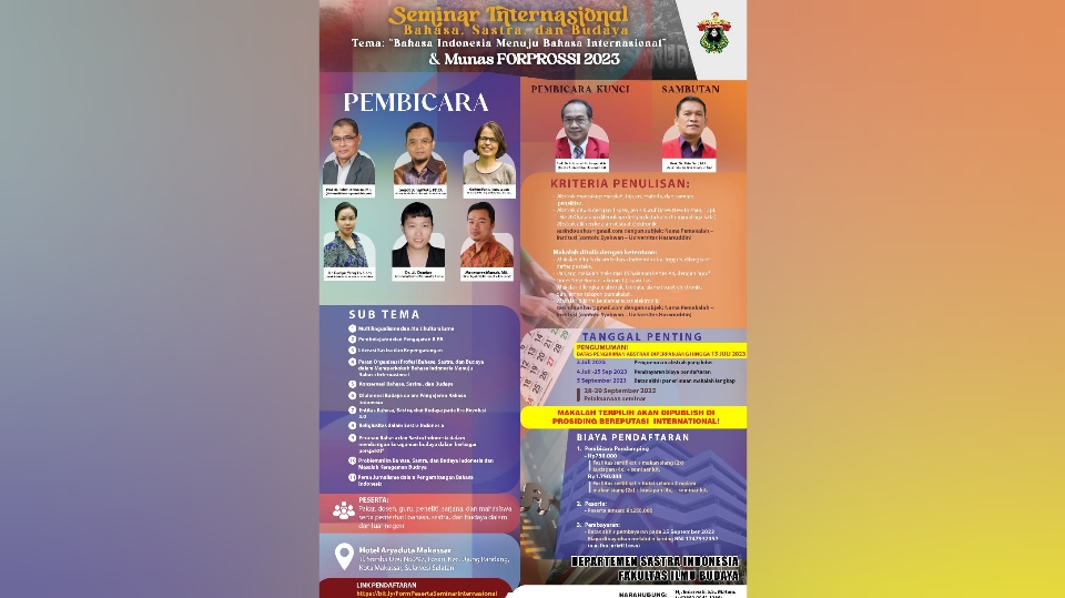 Ketua Panitia Pelaksana Seminar, Dr.H.Ikhwan M.Said, M.Hum, Senin (03/07/2023) menjelaskan, selain pembicara kunci Rektor Unhas Prof.Dr.Ir. Jamaluddin Jompa, M.Sc. dan sambutan Dekan Fakultas Ilmu Budaya Unhas Prof.Dr. Akin Duli, M.A., seminar juga menghadirkan sejumlah pembicara dari luar negeri. Mereka itu Prof. Dr. Rahim Aman, M.Phil. (Universiti Kebangsaan Malaysia) Gogot Suharwoto, Ph.D. (Atase Pendidikan Indonesia, Korea Selatan), Gudrun Fenna Ingratubun (Penulis dan Penerjemah Sastra, Jerman), Dr. Evelyn Yang En Siem (Hankuk University of Foreign Studies, Korea Selatan). Liu Dandan (Nanchang Normal University, China), Manavavee Mamah, M.A (Yala Rajabhat University, Thailand).