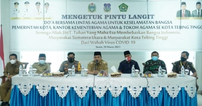 REPUBLIKNEWS.CO.ID, TEBING TINGGI — Menindaklanjuti Surat Edaran Gubernur Sumatera Utara No. 450/2680, imbauan untuk melaksanakan doa bersama lintas Agama secara serentak menghadapi wabah pandemi Covid-19, Wali Kota Tebing Tinggi Umar Zunaidi Hasibuan, menggelar doa bersama Mengetuk Pintu Langit dengan mengusung tema ‘Semoga Allah SWT Tuhan Yang Maha Esa Membebaskan Bangsa Indonesia, Sumatera Utara dan Masyarakat Kota Tebing Tinggi dari Wabah Covid-19’, bertempat di Ruang Aula Lantai IV, Gedung Balai Kota, Senin (29/03/2021).