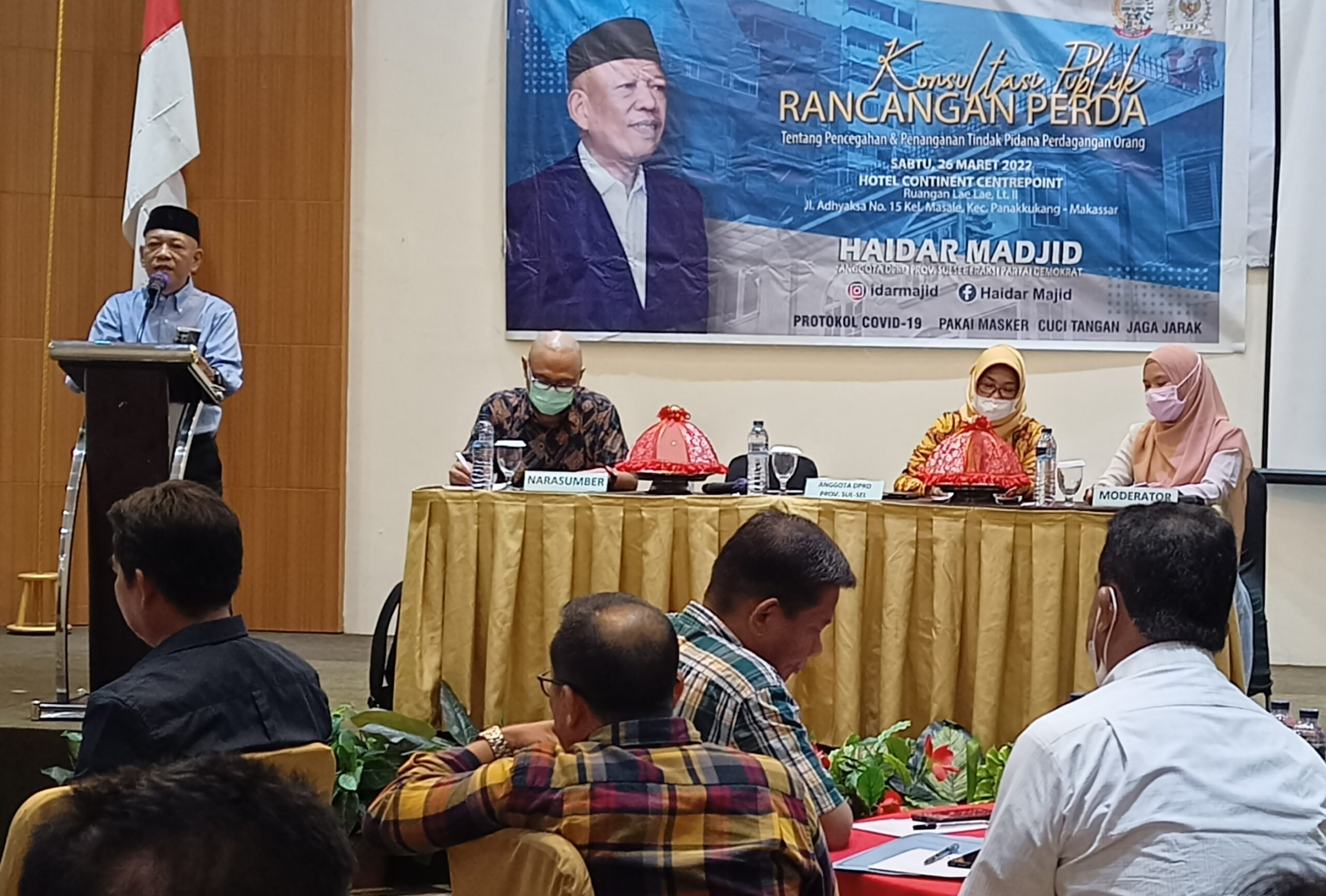 REPUBLIKNEWS.CO.ID, MAKASSAR – Anggota DPRD Provinsi Sulawesi Selatan, Haidar Madjid menggelar kegiatan konsultasi publik terkait Rancangan Perda (Ranperda) tentang pencegahan dan penanganan tindak pidana perdagangan orang. Bertempat di Hotel Continent Centrepoint, Jalan Adhyaksa, Makassar, Sabtu (26/3/2022).