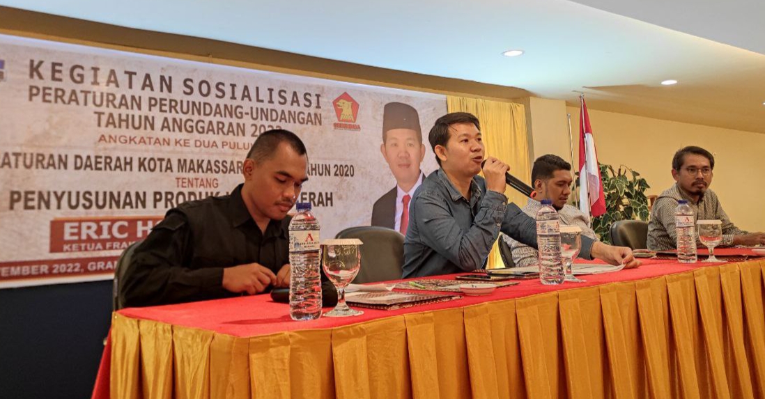Pernyataan tersebut disampaikan Eric Horas saat menyosialisasikan Perda Kota Makassar Nomor 4 Tahun 2020 tentang Penyusunan Produk Hukum Daerah. Kegiatan sosper itu digelar di Hotel Grand Asia, Jalan Boulevard, Kota Makassar, Senin (28/11/2022).