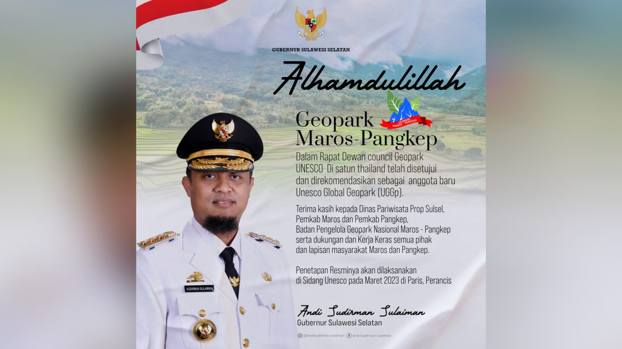“Alhamdulillah Geopark Maros-Pangkep dalam rapat Dewan Council Geopark UNESCO di Satun Thailand telah disetujui dan direkomendasikan sebagai anggota baru UNESCO Global Geopark,” ucapnya.