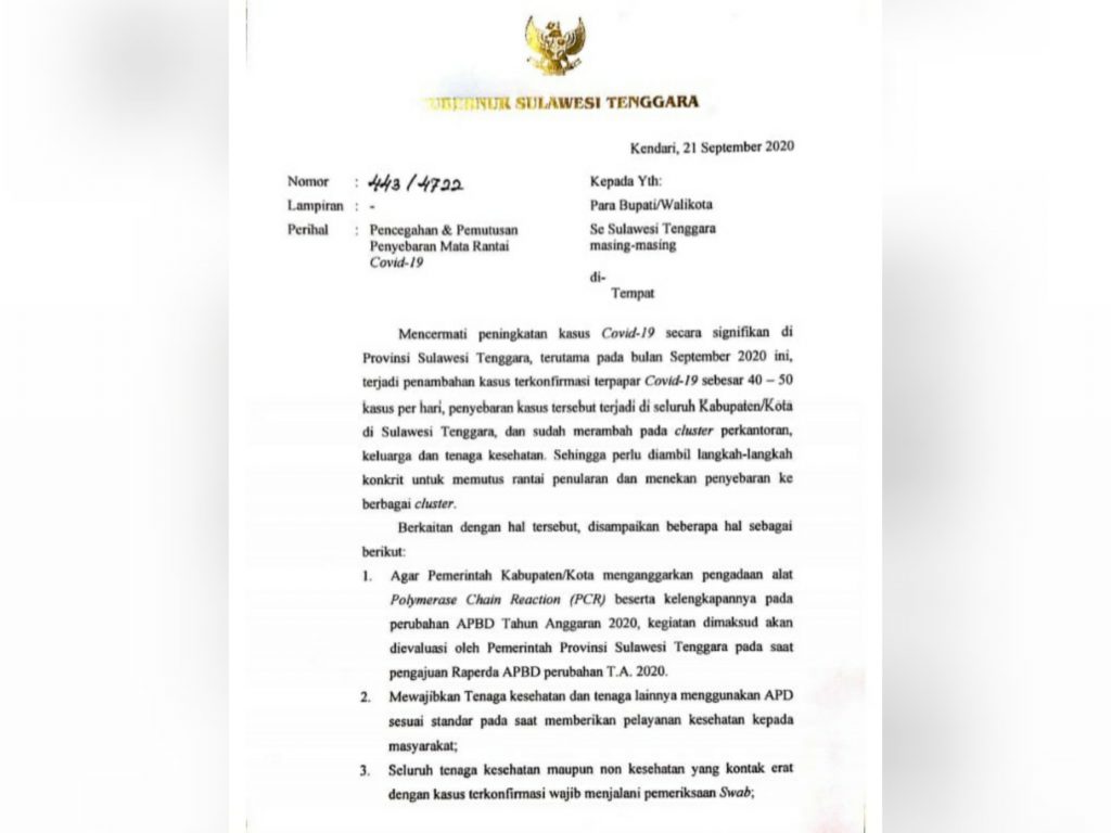 REPUBLIKMEWS.CO.ID, KENDARI — Menanggapi perkembangan pandemi covid-19 Sulawesi Tenggara yang makin meningkat, Gubernur Ali Mazi mengeluarkan beberapa imbauan yang ditujukan kepada seluruh Kepala Daerah di 17 Kabupaten dan Kota se-Sultra.