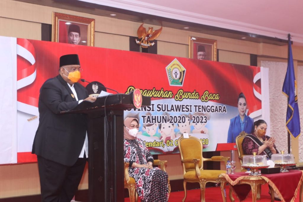 Gubernur Sultra Ali Mazi, memberikan sambutan saat pengukuhan Bunda Baca Sultra, Jumat (02/10/2020).