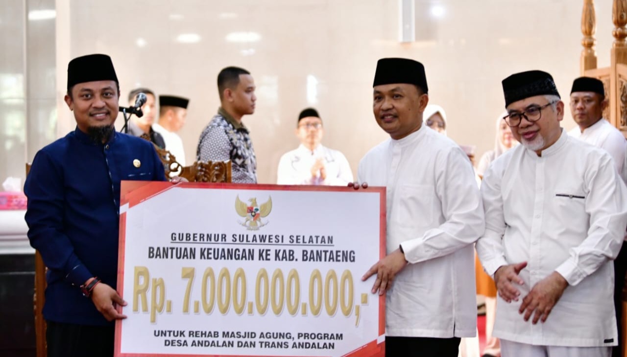 Bantuan keuangan itu diserahkan Gubernur kepada Bupati Bantaeng Ilham Syah Azikin di Masjid Agung Syekh Abdul Gani Bantaeng, Selasa (01/08/2023).