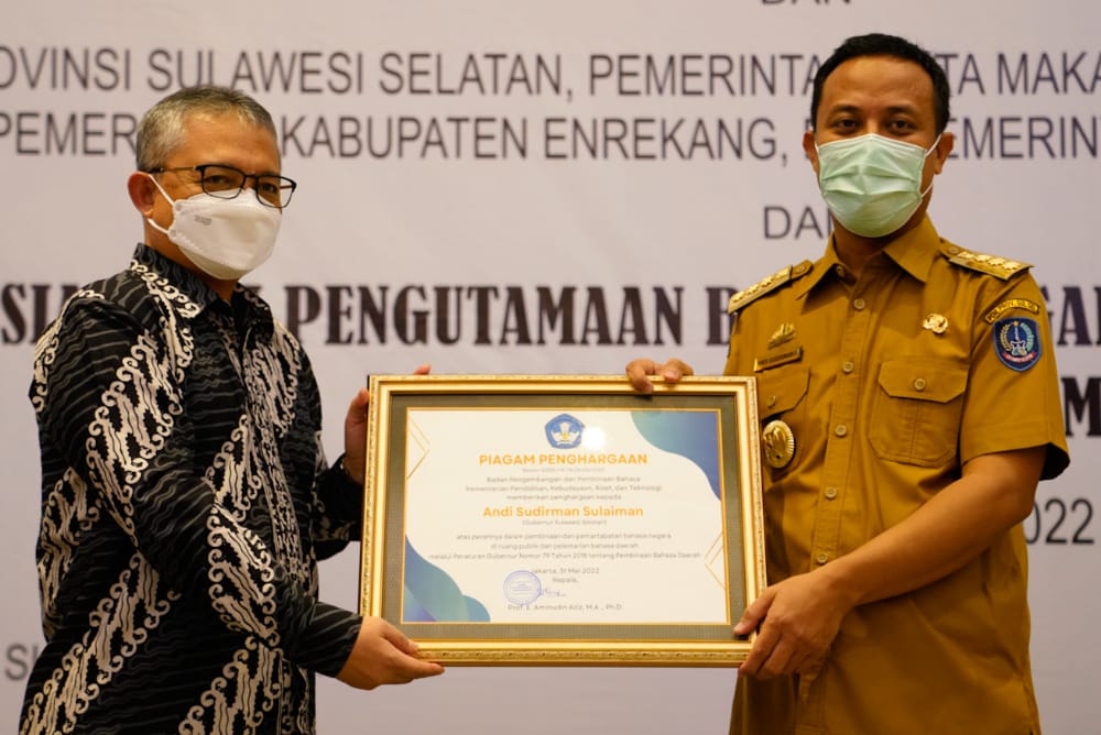 REPUBLIKNEWS.CO.ID, MAKASSAR – Gubernur Sulawesi Selatan, Andi Sudirman Sulaiman menerima penghargaan dari Badan Pengembangan dan Pembinaan Bahasa Kementerian Pendidikan, Kebudayaan, Riset dan Teknologi (Kemendikbudristek) RI.