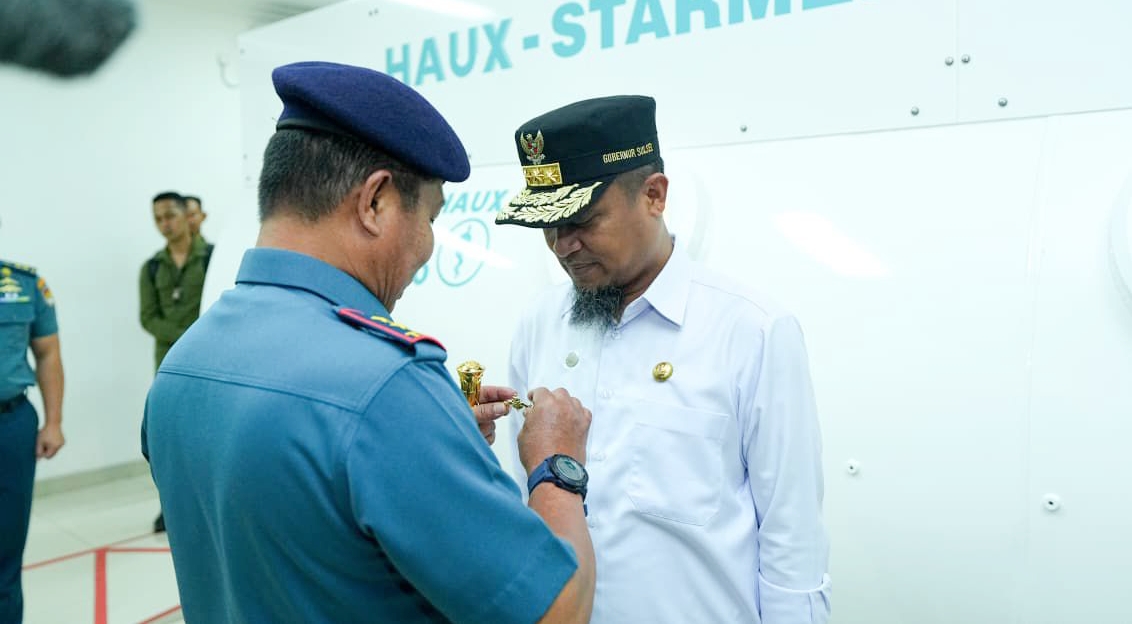REPUBLIKNEWS.CO.ID, MAKASSAR – Gubernur Sulawesi Selatan, Andi Sudirman Sulaiman menerima tanda penganugerahan Brevet Kehormatan Hiperbarik TNI Angkatan Laut dari Panglima Komando Daerah Angkatan Laut (Dankodaeral) VI, Laksda TNI Andi Abdul Aziz di Gedung Rumkital Jala Ammari, Mako Kodaeral VI, Jalan Satando, Makassar, Kamis (9/10/2025).