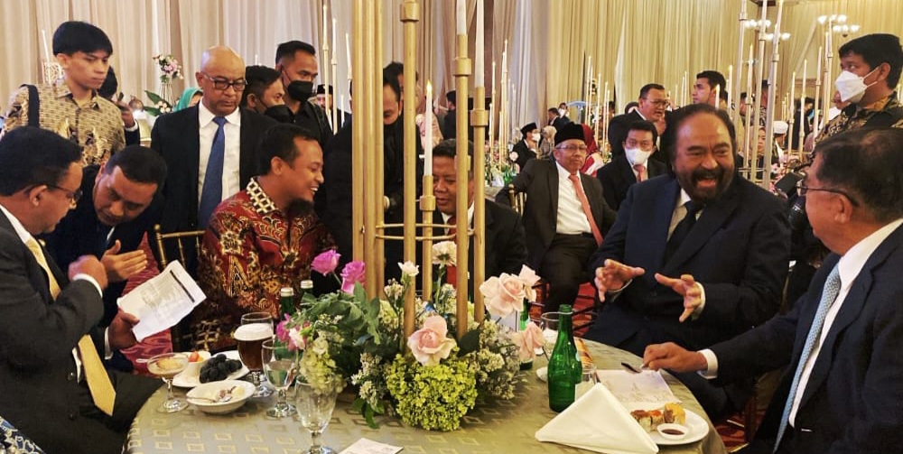 Andi Sudirman terlihat satu meja dengan Wakil Presiden Indonesia ke-10 dan ke-12 Muhammad Jusuf Kalla, Mantan Gubernur DKI Jakarta Anies Baswedan, dan Ketua Umum Partai NasDem Surya Dharma Paloh.