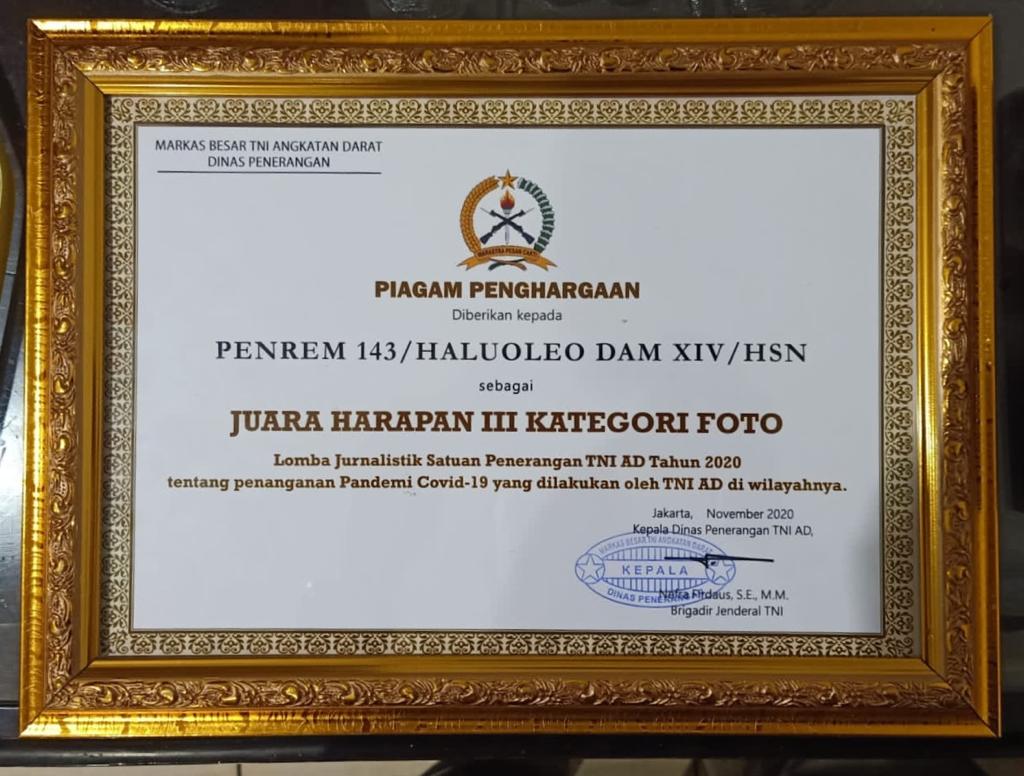 REPUBLIKNEWS.CO.ID, Kendari– Hadir dalam kegiatan Rapat Evaluasi Penerangan Angkatan Darat Tahun 2020, Penrem 143/HO mendapatkan apresiasi oleh Dispenad dalam Lomba Karya Jurnalistik.
