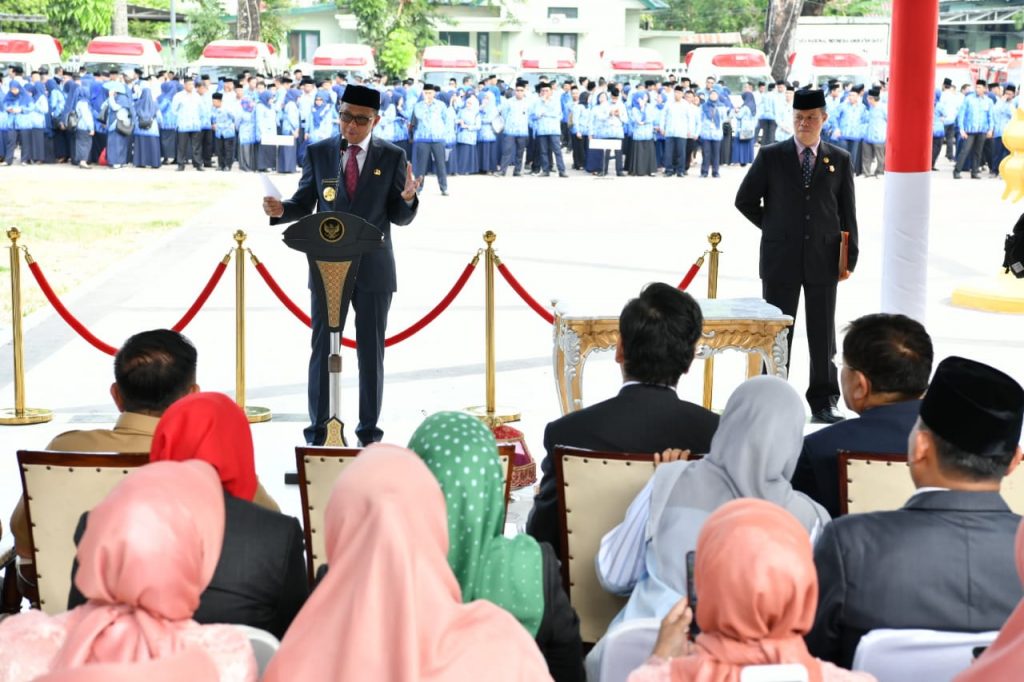 Prof Nurdin membacakan sambutan seragam dari Presiden Republik Indonesia, Ir Joko Widodo di hadapan seluruh Aparatur Sipil Negara (ASN) lingkup Pemprov Sulsel serta para pejabat di Dinas Bina Marga dan Bina Konstruksi Provinsi Sulawesi Selatan.