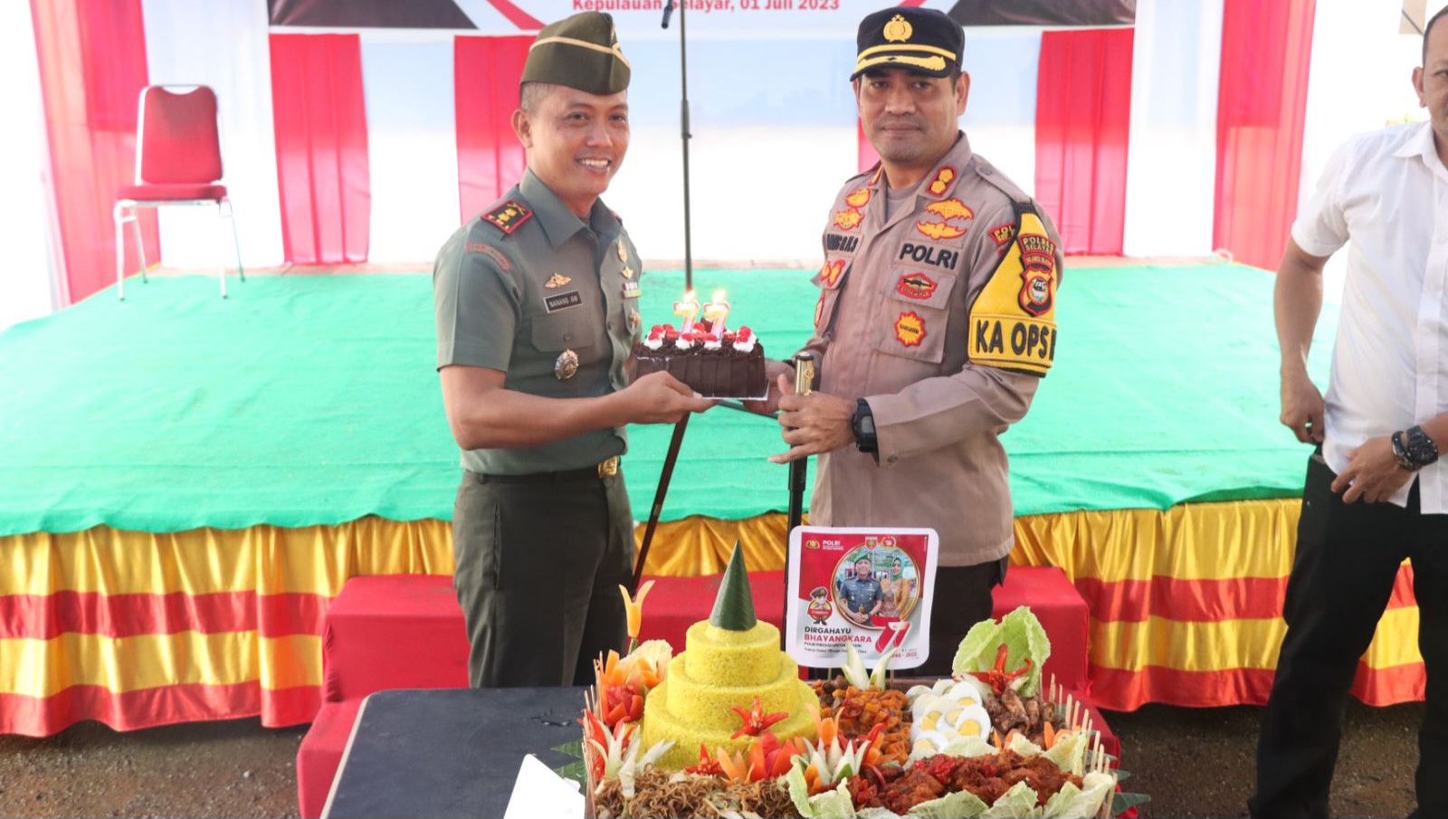 Nasi Tumpeng dipotong oleh Kapolres dan diberikan kepada Personel tertua Kodim 1415 Selayar, sedangkan Kue Hari Bhayangkara ke-77, dipotong oleh Dandim dan diserahkan kepada Personel Polres termuda.