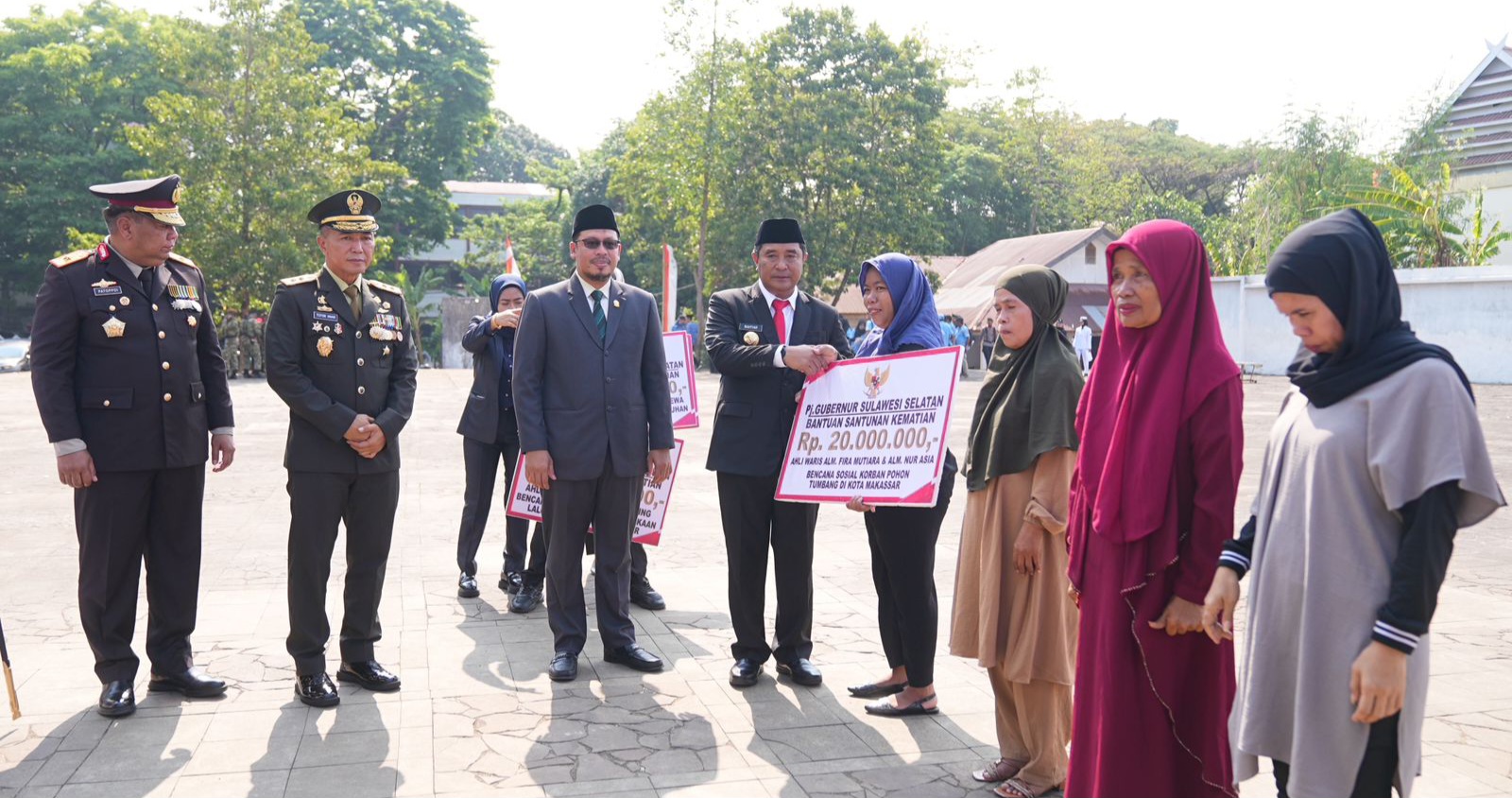 REPUBLIKNEWS.CO.ID, MAKASSAR — Penjabat Gubernur Sulsel Bahtiar Baharuddin, memimpin upacara peringatan Hari Pahlawan Nasional, yang dilaksanakan di Taman Makam Pahlawan, Jalan Panaikang, Kota Makassar, Jumat (10/11/2023). Usai pelaksanaan upacara, Pj Gubernur Bahtiar bersama Pangdam XIV Hasanuddin Mayjen TNI Totok Imam Santosa, menyerahkan bantuan untuk korban bencana sosial.