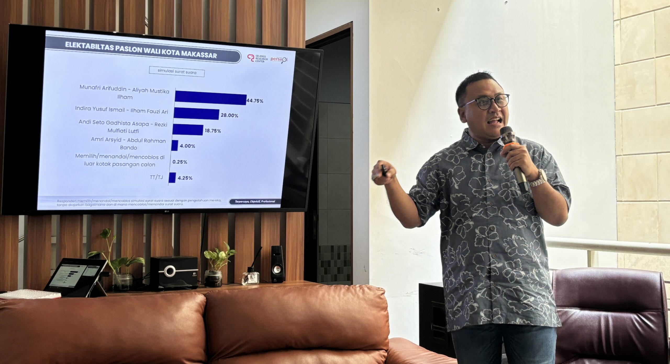 REPUBLIKNEWS.CO.ID, MAKASSAR – Celebes Research Center (CRC) merilis hasil survei terbarunya terkait tingkat elektoral pasangan calon kontestan Pilwalkot Makassar 2024. Hasil survei tersebut dirilis di Kantor CRC, Jalan Adhyaksa IV, Makassar, Selasa (29/10/2024).