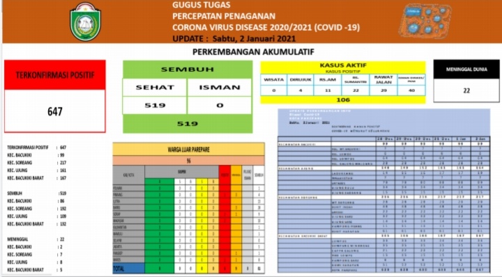 “Sehingga sampai saat ini total sudah 647 kasus di Parepare yang tersebar di 4 kecamatan. Tertinggi di Kecamatan Soreang 217 kasus, lalu Bacukiki Barat 167 kasus, Ujung 161 kasus, dan Bacukiki 99 kasus,” ungkap Rachmawaty, Minggu (03/01/2021).