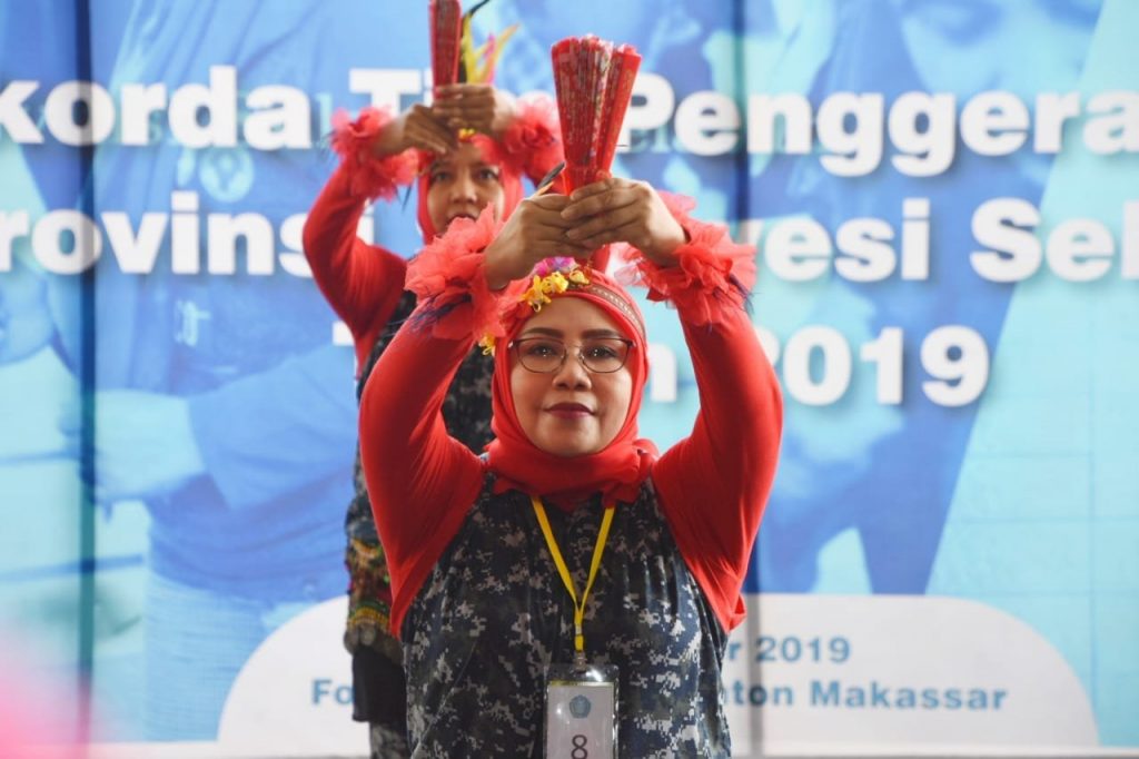 Dengan kostum Merah perpaduan navi loreng, Ketua TP PKK Kabupaten Soppeng Hj.Nurjannah mengatakan tim yang dipimpin ikut andil dalam lomba senam poco-poco yang tiada lain ikut menyemaeakkan HKG ke-40 tahun 2019.