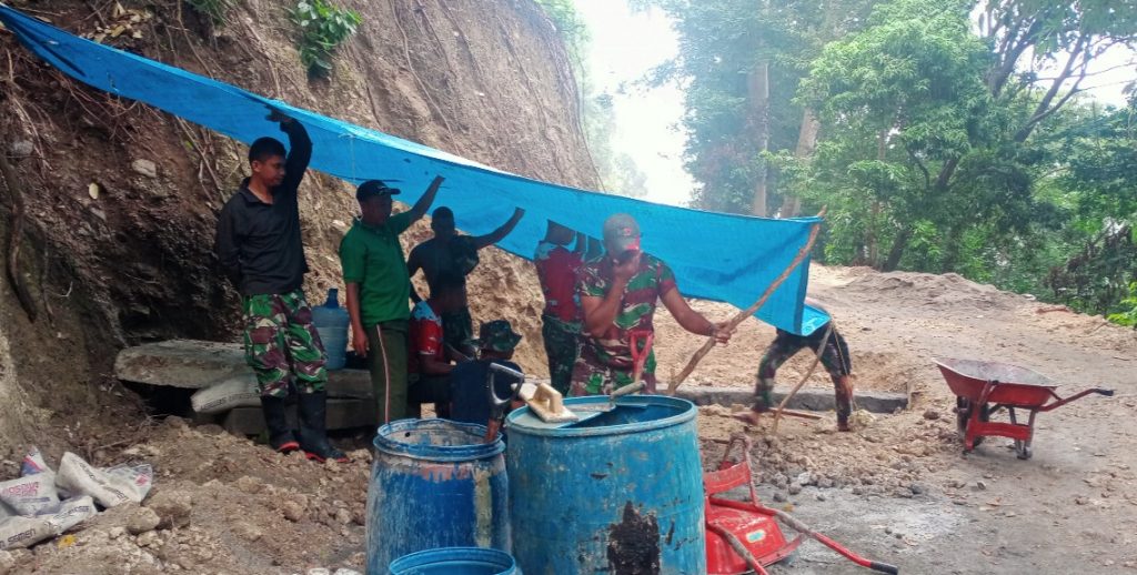 “Untuk jalan mendaki dan menurun memang sudah ditimbun namun masih riskan untuk dilalui dalam kondisi hujan seperti ini, ” jelas Pasi. Ops. Kapten ARM. Husain Djafar, Kamis (08/07/2021) di titik NOL TMMD Ke 111 Kodim 1415 Selayar.