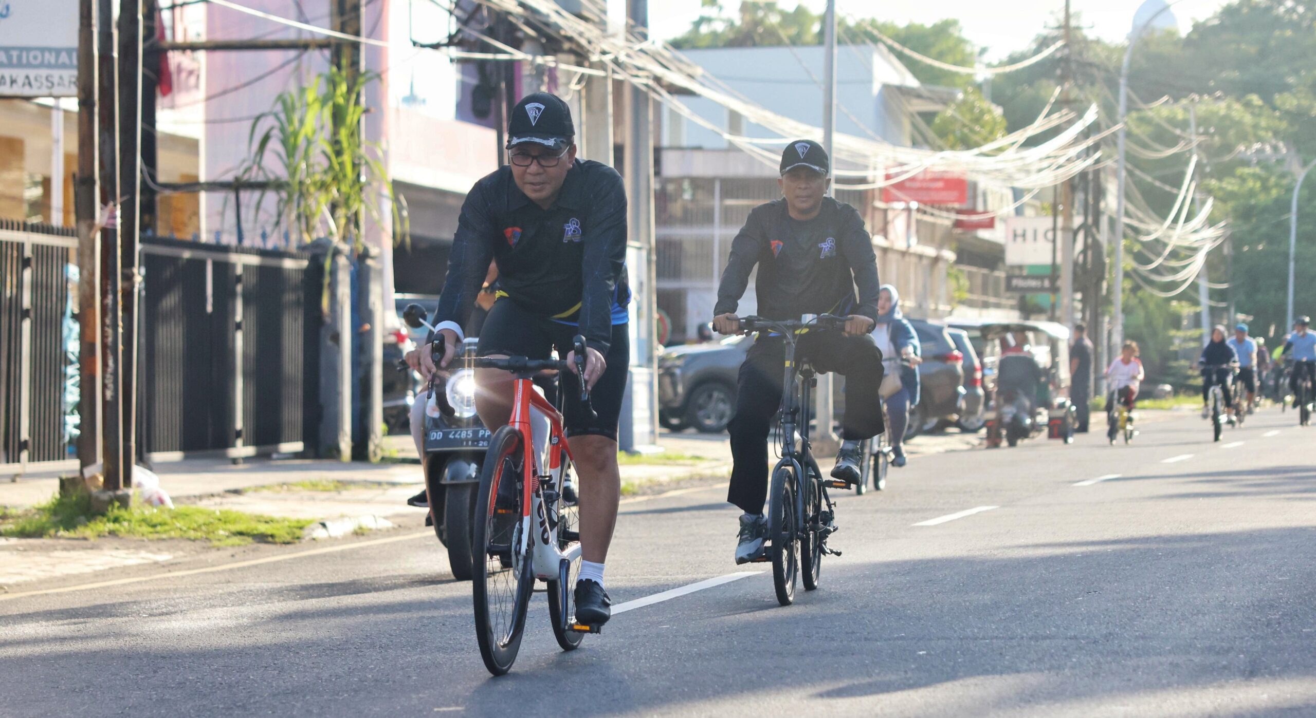 Mengenakan pakaian olahraga serba hitam, Danny Pomanto didampingi Kepala Satpol PP Makassar Ikhsan mengikuti fun bike melintasi rute sejauh 8 kilometer.
