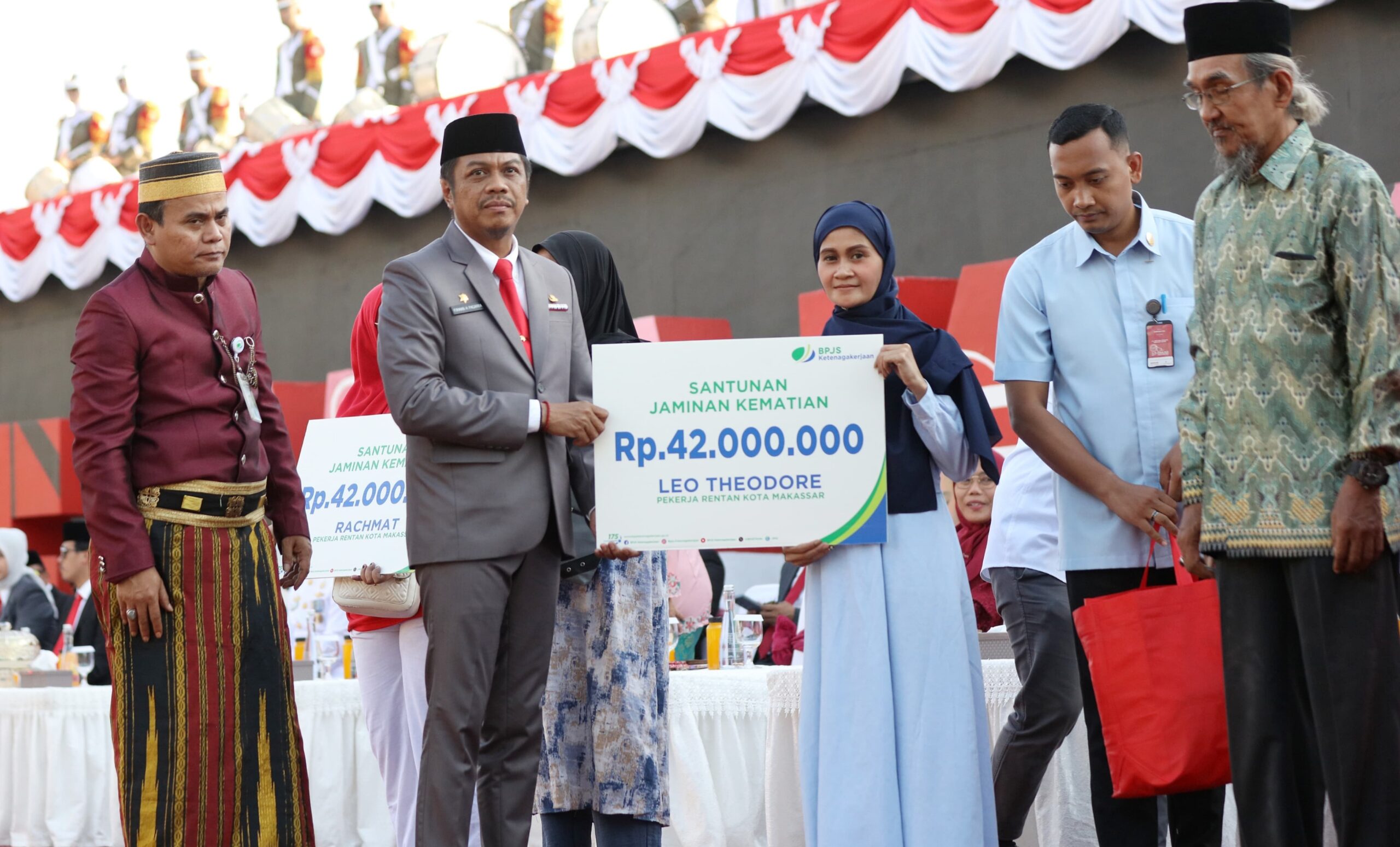 Olehnya itu, Penjabat (Pj) Sekda Kota Makassar, Firman Hamid Pagarra melalui BPJS Ketenagakerjaan secara simbolis memberikan santunan Jaminan Kematian (JKM) kepada 10 ahli waris.