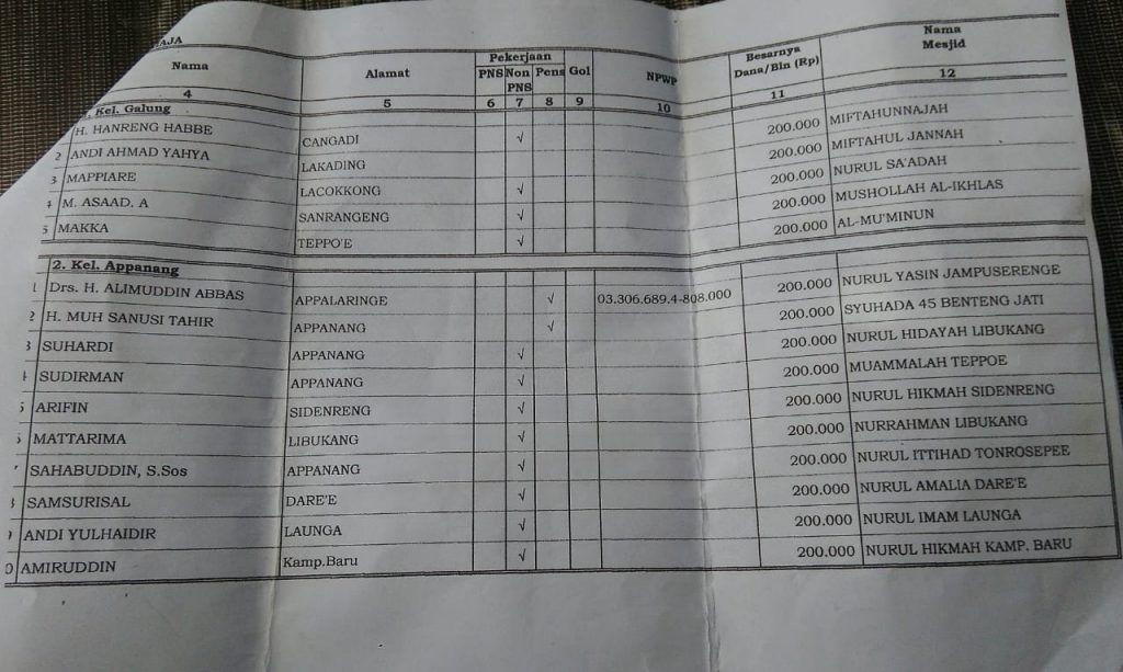 REPUBLIKNEWS.CO.ID, SOPPENG — Dari 10 nama Imam Masjid yang ada di Kelurahan Appanang, Kecamatan Liliriaja, Kabupaten Soppeng, yang menerima Insentif, 1 orang diantaranya hingga saat ini belum menikmatinya, yakni Andi Yulhaidir Imam Masjid Launga.