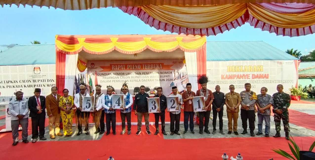 REPUBLIKNEWS.CO.ID, KEPI – Komisi Pemilihan Umum (KPU) Kabupaten Mappi menggelar rapat pleno terbuka pengundian dan penetapan nomor urut bagi lima pasangan calon peserta Pilkada Mappi tahun 2024. Pengundian nomor urut tersebut digelar di halaman Kantor KPU Kabupaten Mappi, Jalan Irian Kilometer 01, Kepi, Senin (23/9/2024).