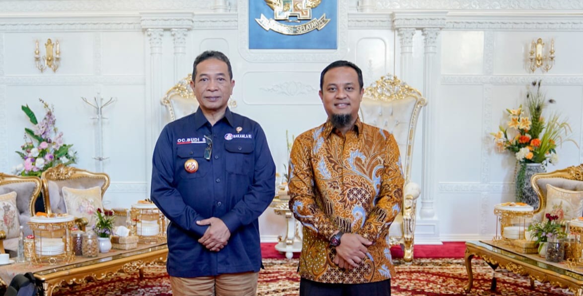 REPUBLIKNEWS.CO.ID, MAKASSAR — Gubernur Sulsel Andi Sudirman Sulaiman, menerima kunjungan Kepala Kantor Zona Tengah Badan Keamanan Laut Republik Indonesia (Bakamla RI), Laksma Bakamla Octavianus Budi Santoso di Rumah Jabatan Gubernur Sulsel, Kamis (08/06/2023) kemarin.