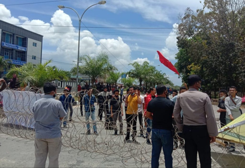 REPUBLIKNEWS.CO.ID, KENDARI — Halaman depan Mapolda Sultra dikelilingi pagar duri untuk mengamankan aksi unjuk yang dilakukan oleh sejumlah elemen pemerhati yang menuntut diselesaikannya kasus kematian Randi dan Yusuf, pada Sabtu (26/09/2020).