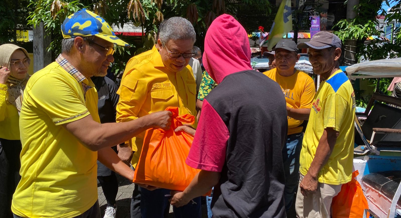 Pembagian sembako kali ini ditujukan ke puluhan tukang bentor dan becak di Kantor DPD I Golkar Sulsel, Jalan Botolempangan, Makassar, Kamis (30/10/2025).