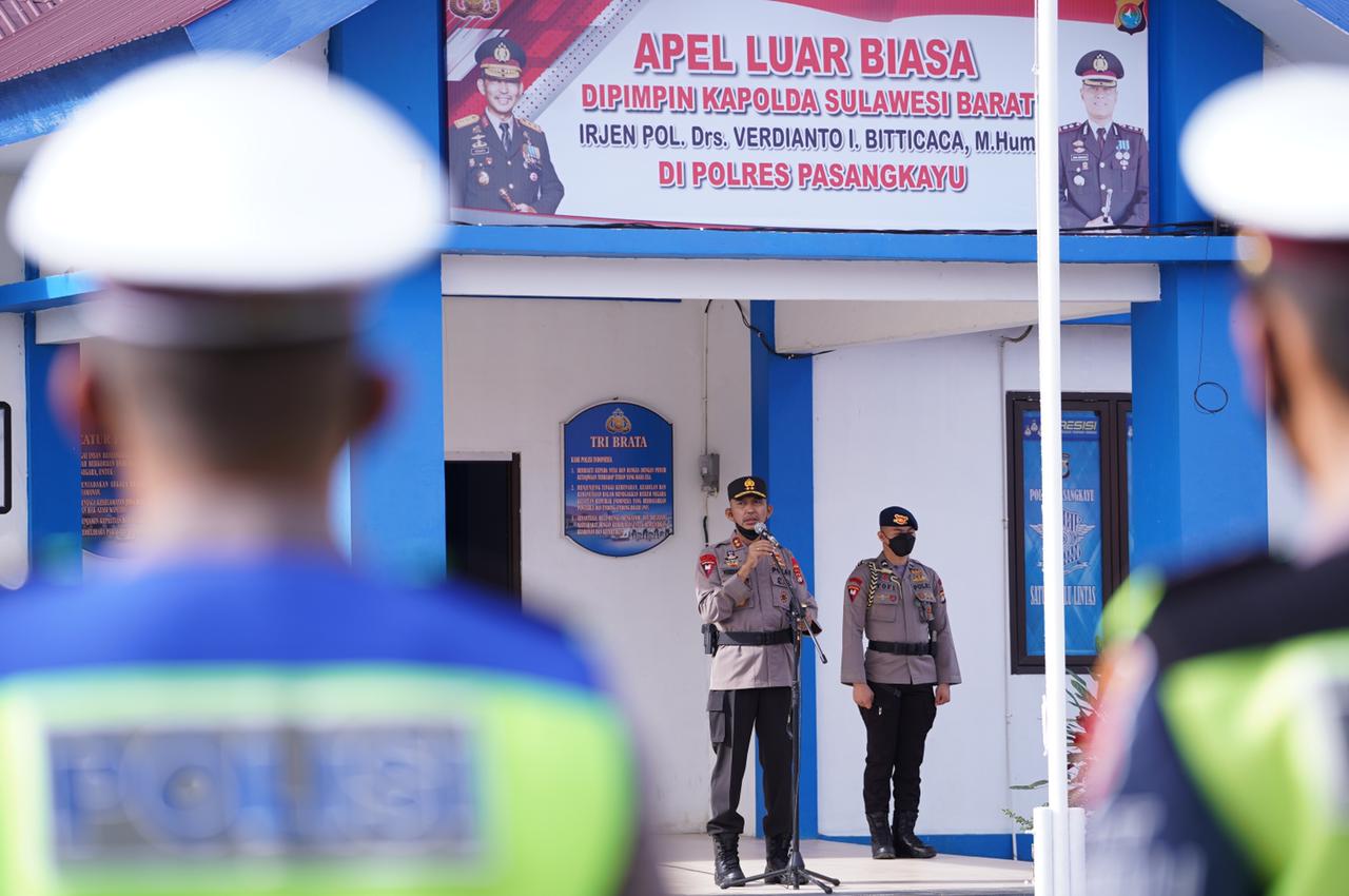 Dalam kunjungannya kali ini, Kapolda Sulbar yang didampingi Kapolres Matra AKBP Didik Subiyakto memberikan pengarahan kepada seluruh personil Polres Mamuju tengah pada acara apel luar biasa.