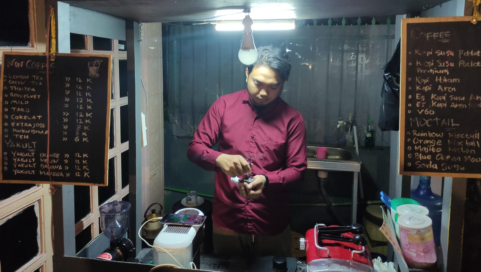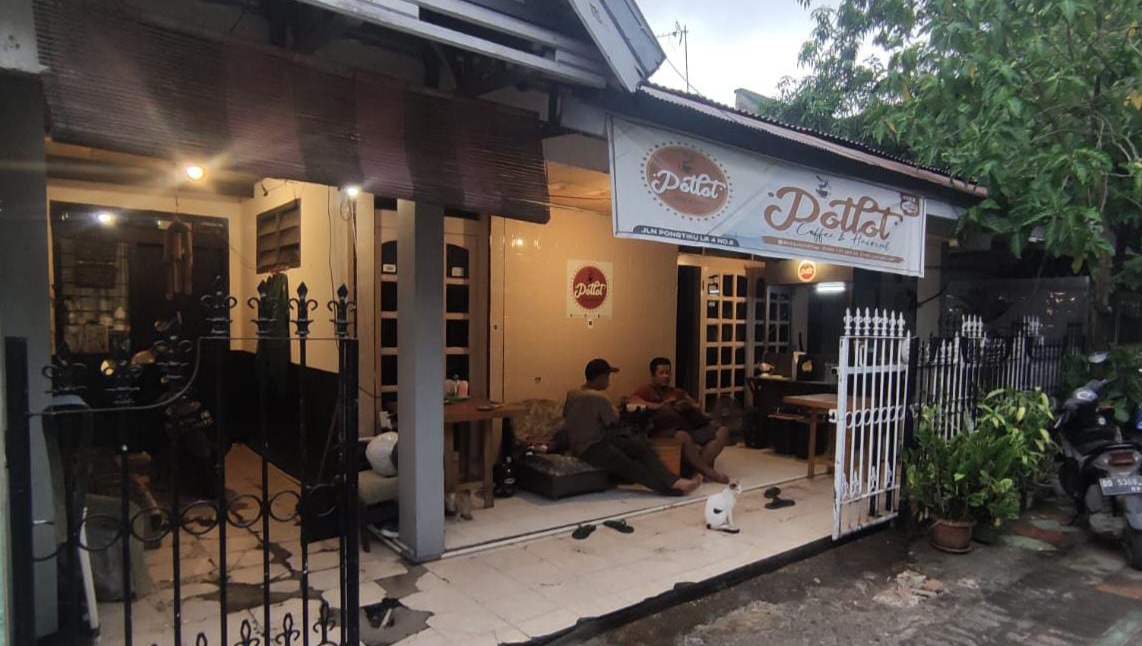 Setelah mengantarkan kopi pesanan pelanggan jenis kopi susu aren yang memang merupakan pilihan kopi favorit pelanggan, Muhammad Fauzan Ramli yang merupakan pemilik coffeeshop kembali duduk di meja kasir. Ia kemudian mengutak-atik smartphone miliknya. Sejak merintis usaha coffeshopnya dengan brand Potlotcoffee, dirinya juga melakukan penjualan lewat online.