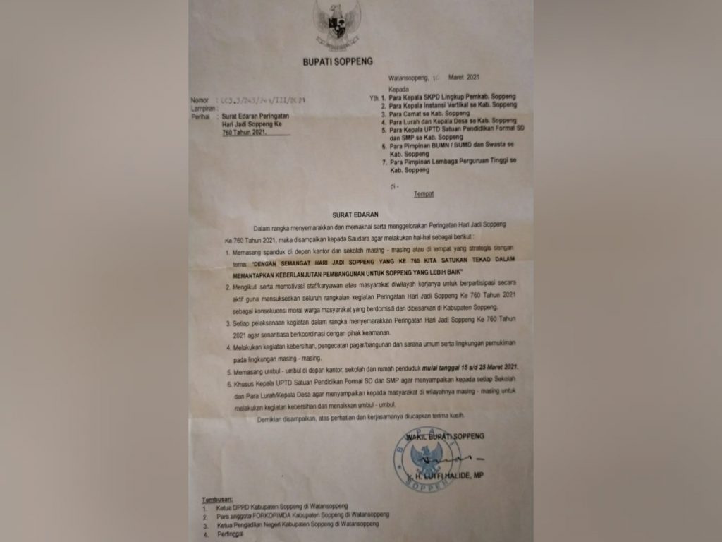 Sebagaimana didalam surat edaran yang ditanda tangani Wakil Bupati Soppeng Lutfi Halide, bahwa dalam rangka menyemarakkan dan memaknai serta menggelorakan peringatan hari Jadi Soppeng yang ke-760 tahun 2021 diserukan untuk memasang spanduk di depan Kantor dan Sekolah masing-masing atau di tempat yang strategis dengan Tema “Dengan semangat hari Jadi Soppeng yang ke-760 Kita Satukan tekad dalam memantapkan Kebersamaan Pembangunan untuk Soppeng yang lebih baik”.