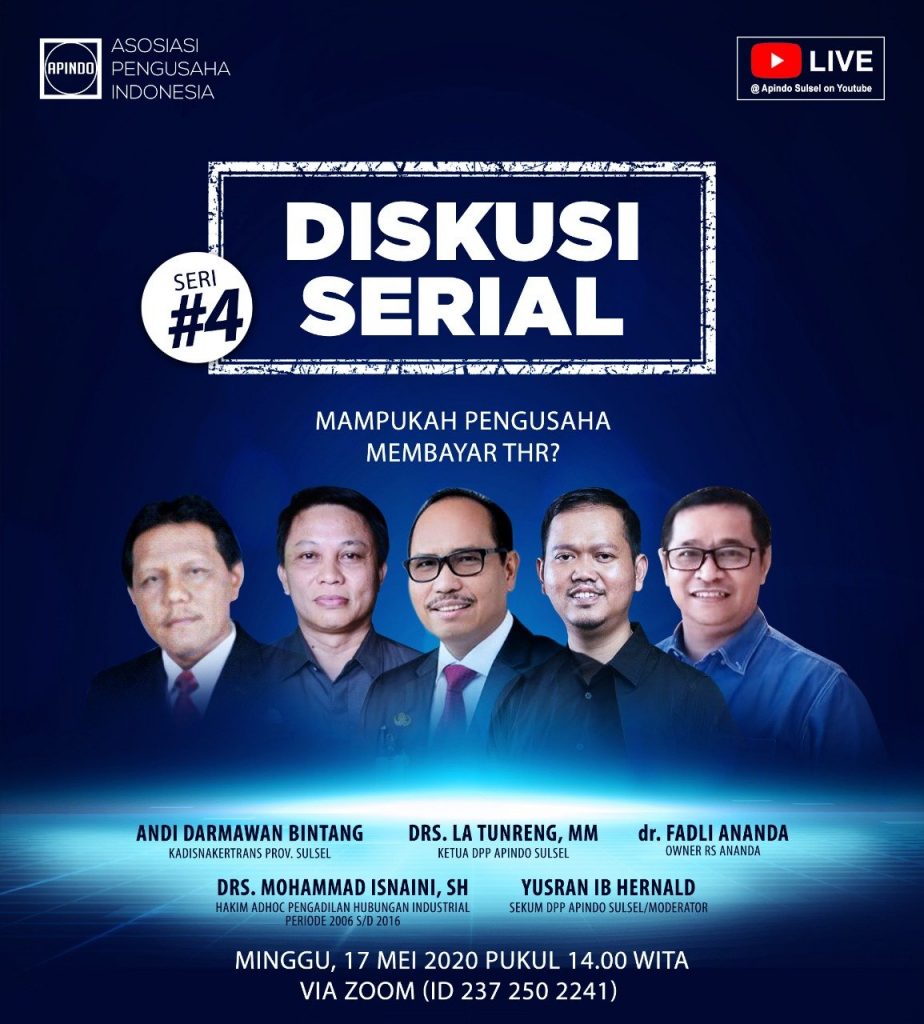 Pada diskusi ini Apindo Sulsel mengangkat Tema “Mampukah Pengusaha Membayar THR”, secara Daring melalui aplikaso Zoom, yang akan digelar pada Minggu (17/05/2020), Pukul 14.00 wita.